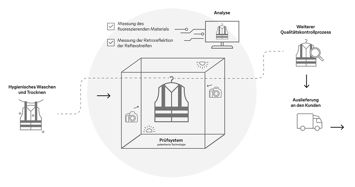 In einem vollautomatischen Kontrollprozess werden die Kleidungsstücke nach dem Waschen und Trocknen auf Bügeln hängend über ein Fördersystem durch die Prüfanlage transportiert. Dort wird der Leuchtdichtefaktor des fluoreszierenden Gewebes und der spezifische Rückstrahlwert der Retroreflexstreifen erfasst und dokumentiert. Stellt die Software fest, dass ein Kleidungsteil außerhalb der Normwerte liegt, wird es automatisch separiert und einem weiteren Kontrollprozess unterzogen. Die KI-gestützte Technologie ergänzt die bisher übliche Sichtkontrolle und bringt noch mehr Sicherheit für unsere Kunden. Die Ergebnisse werden automatisch dokumentiert und können den Kunden bei Bedarf, zum Beispiel für eine Auditierung, zur Verfügung gestellt werden.