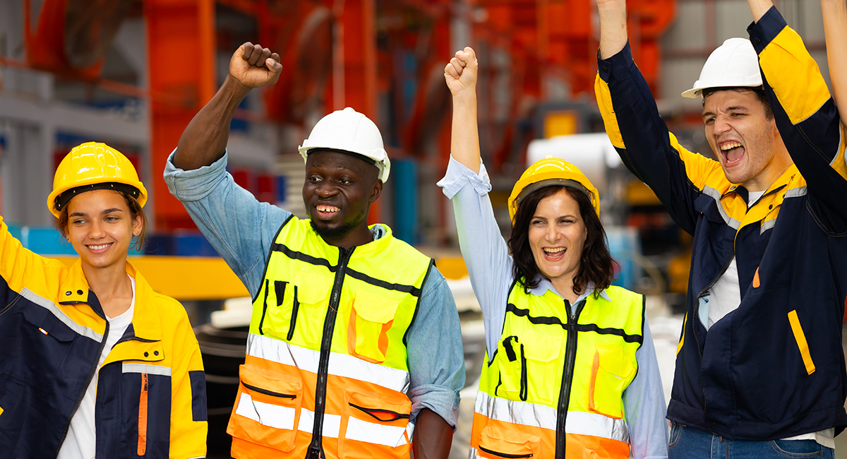 Vier Beschäftigte in Helmen und Warnwesten jubeln gemeinsam in einer Werkhalle.
