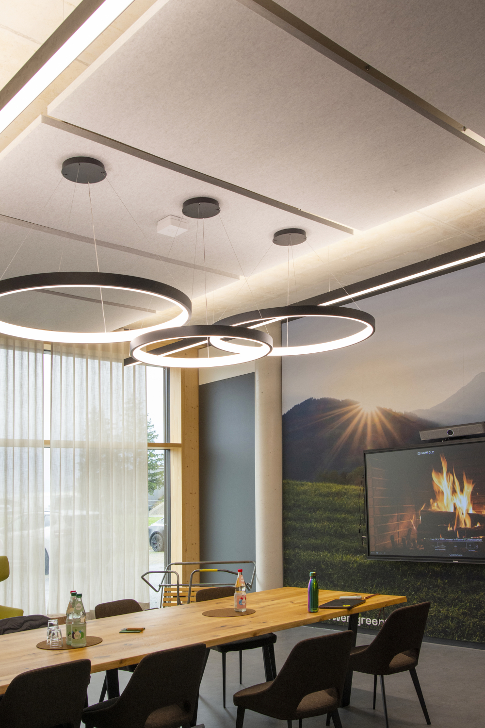 Auch optisch fügen sich die hellgraumelierten Elemente harmonisch in das architektonische Gesamtkonzept ein. Die marmorierte Oberfläche bildet einen spannenden, aber zugleich ruhigen Kontrast zum Sichtbeton der Decken. In Kombination mit den indirekten linearen Deckenleuchten entsteht ein hochwertiges, modernes Deckenbild, das Technik, Design und Funktionalität verbindet.