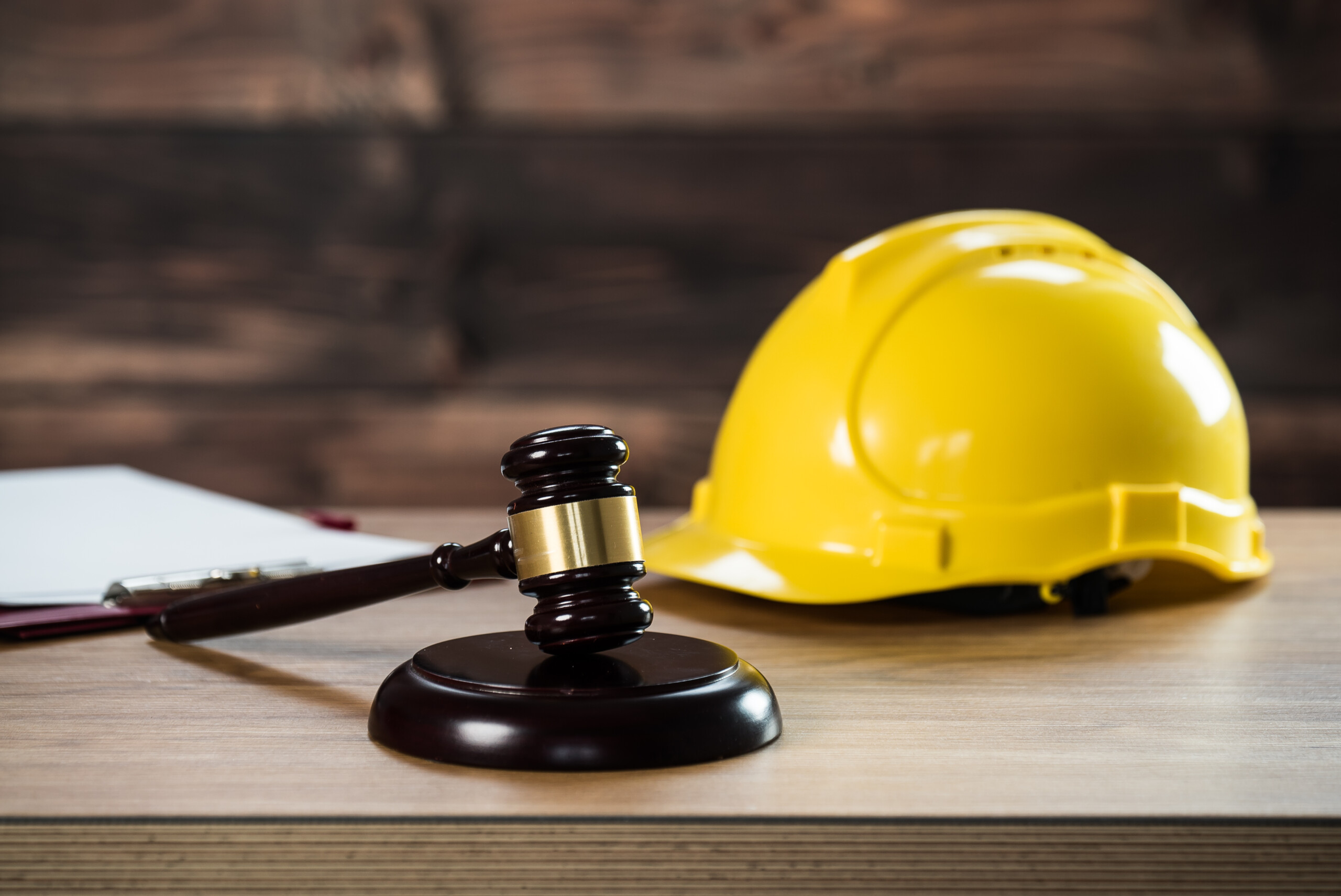 Ein Richterhammer liegt auf einem Schreibtisch neben einem gelben Schutzhelm.