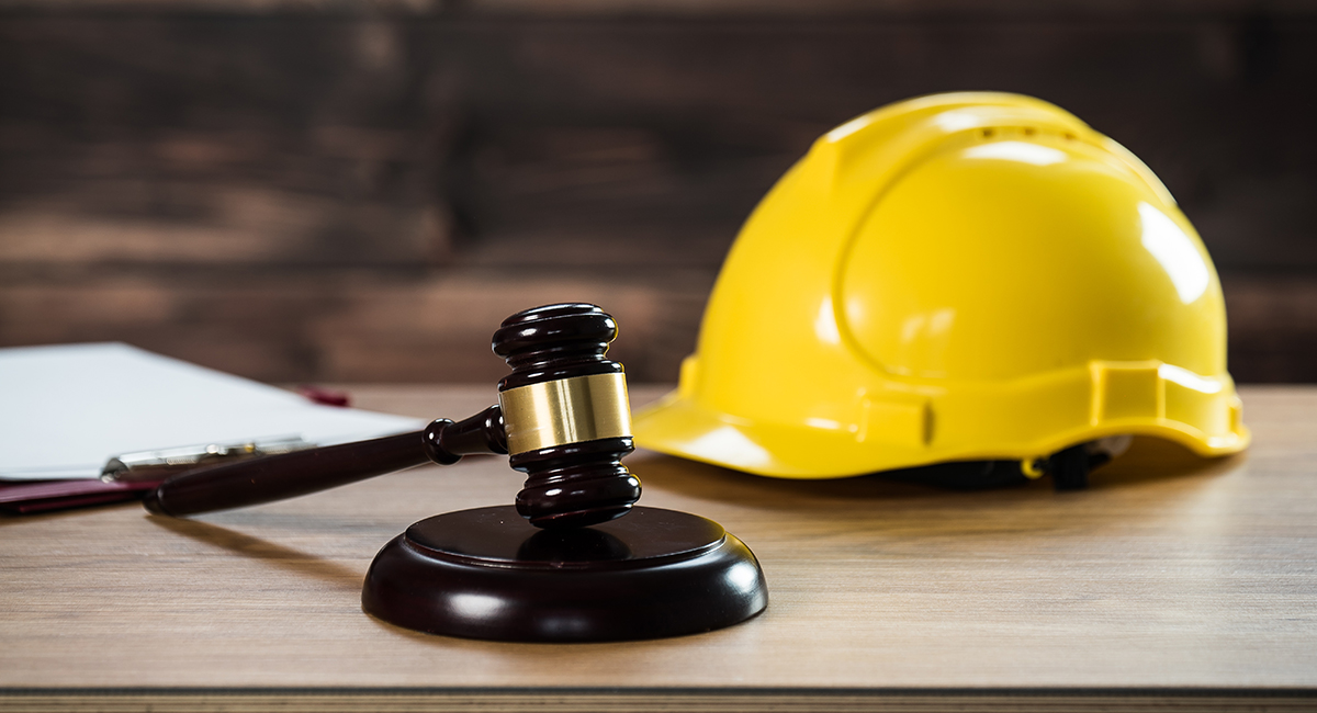 Ein Richterhammer liegt auf einem Schreibtisch neben einem gelben Schutzhelm.