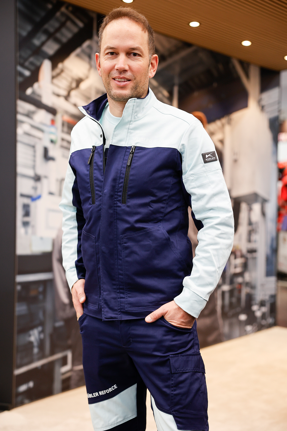 Kübler präsentierte mit Reforce eine neue Generation von Workwear, die Funktionalität, Nachhaltigkeit und Design vereint. Auffällig ist das dynamische, dezente Color-Blocking, das sich auf ein klares, professionelles Erscheinungsbild konzentriert. Die Kollektion basiert auf einem innovativen Stretch-Mischgewebe aus: